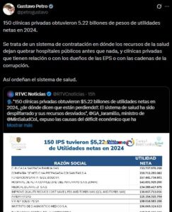 El presidente Gustavo Petro lanzó una dura crítica al actual esquema de contratación en salud, apoyándose en cifras de utilidades del año 2024 que calificó de «alarmantes». A través de sus redes sociales, el jefe de Estado denunció que el modelo vigente permite que 150 clínicas privadas obtengan ganancias netas por $5.22 billones, mientras la red pública de hospitales lucha por no desaparecer.
