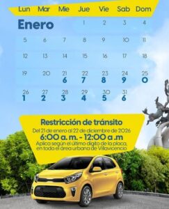 A partir del lunes 26 de enero, Villavicencio retorna a la normalidad vial con el pico y placa, que contará con dos franjas horarias y que será para vehículos particulares y de servicio público y que no aplicará para motocicletas.